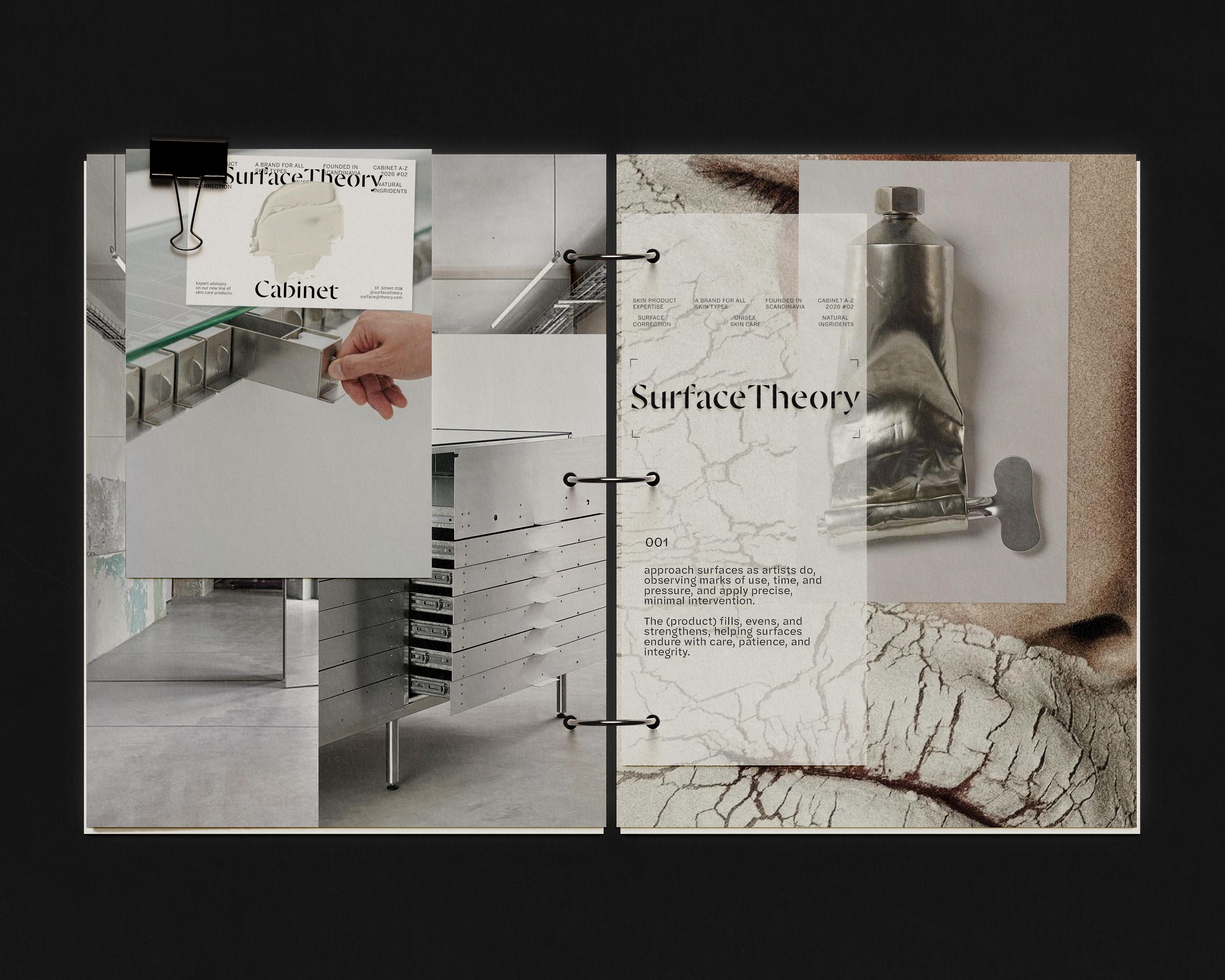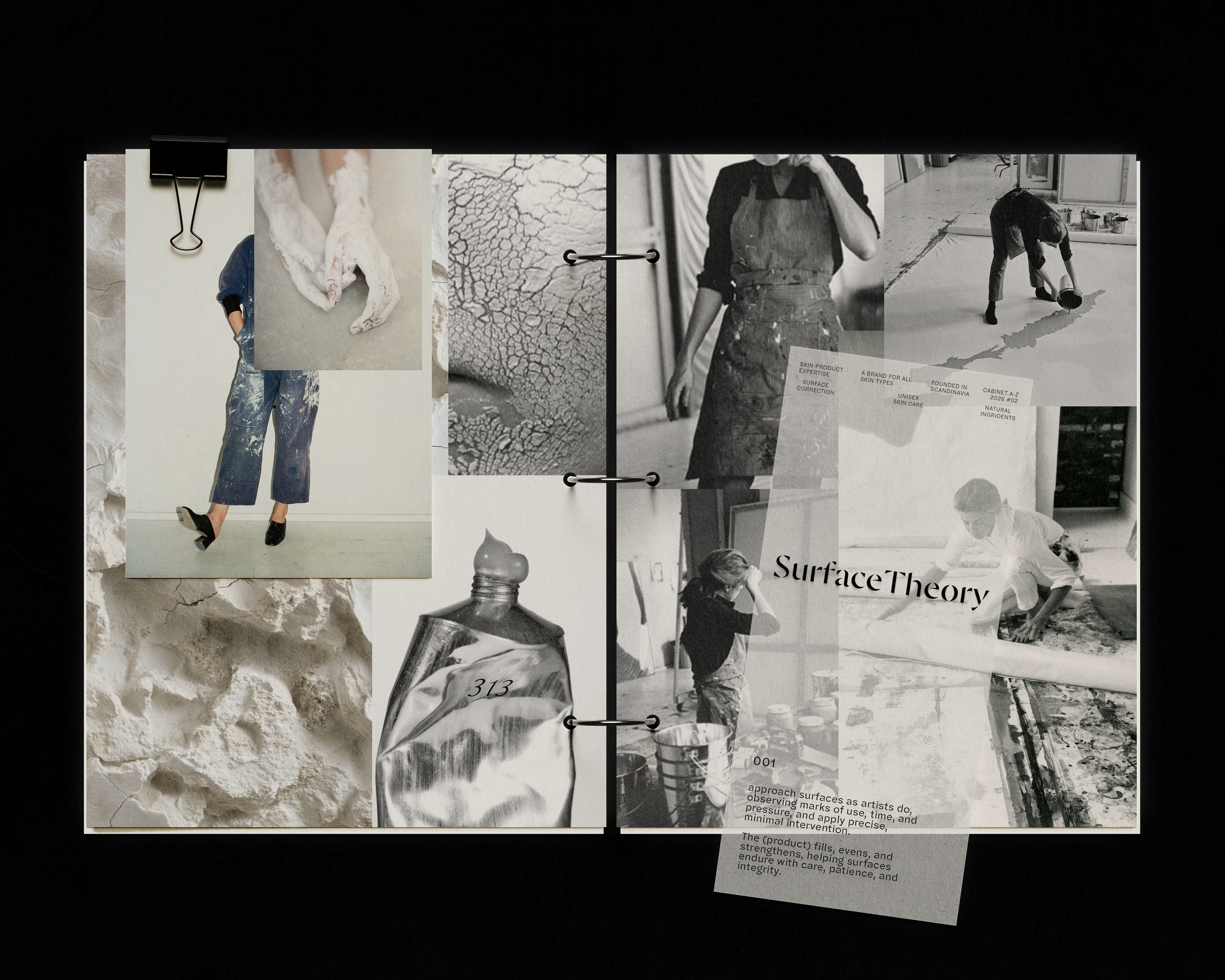 Contemporary new artists as models. Atelier feel. The aesthetic of: studio shots of painter Helena Frankenthaler + industrial design. Materials and tools for making and preserving beauty / art. The care for unique surfaces. Stainless steel. Soft tones. Concrete. Patina. Transparency. Plaster and paint as creams and masks.
