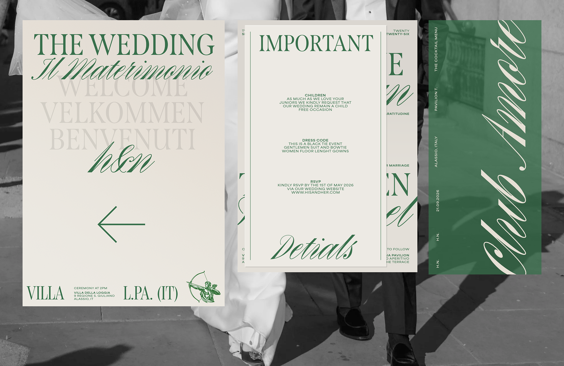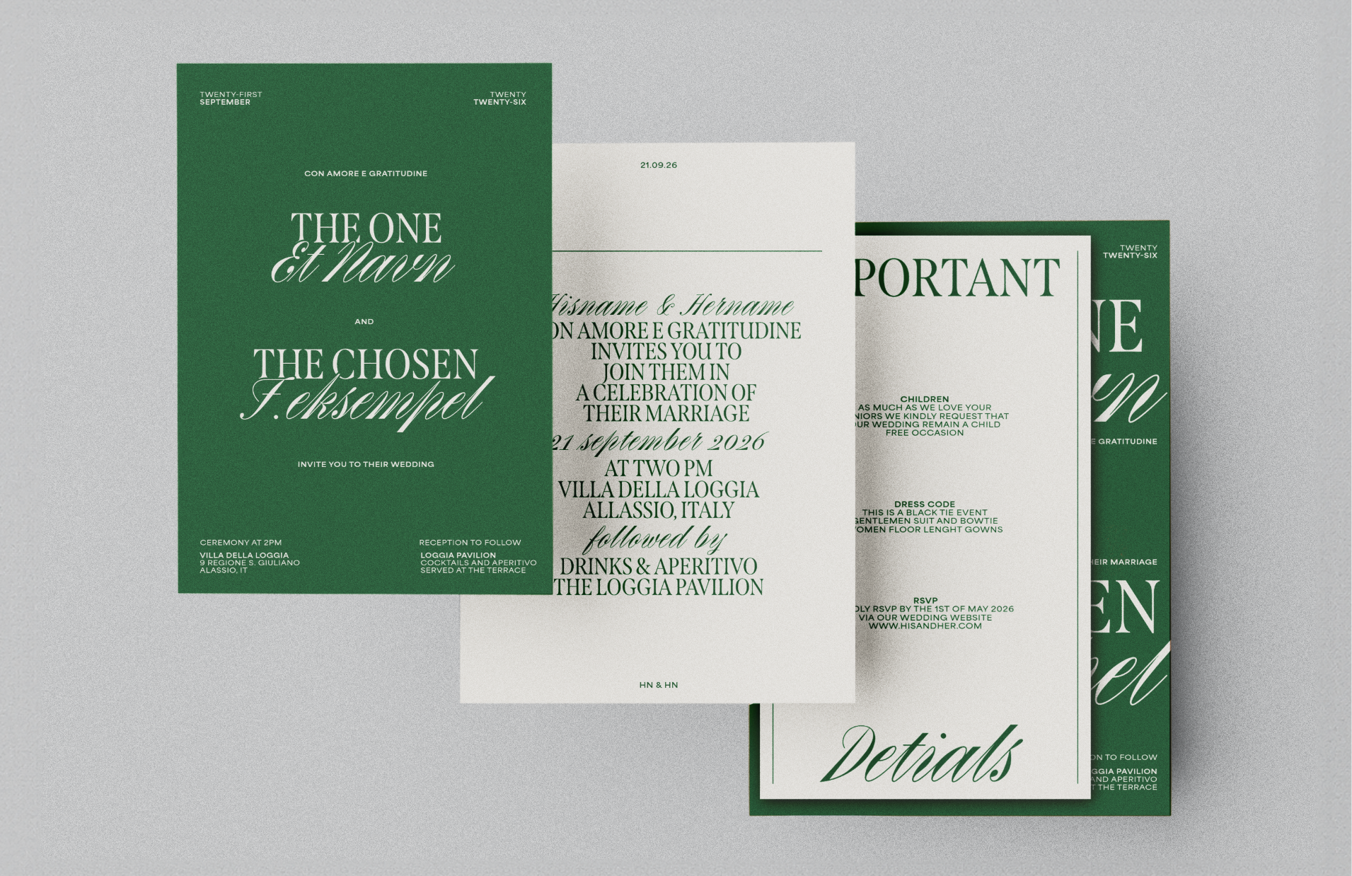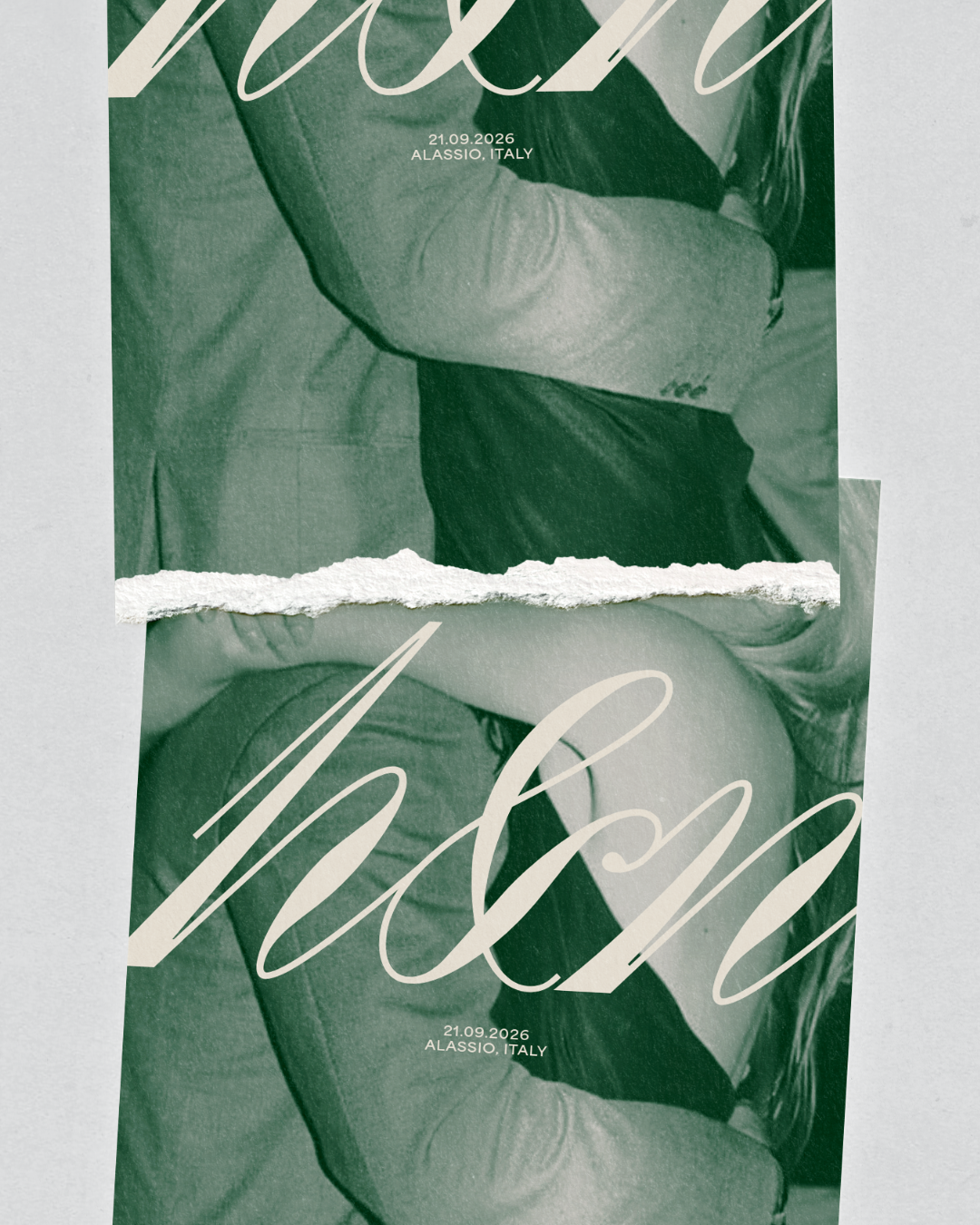 Concept, design and art direction for a wedding in Italy. Rooted in classic Italian elegance and reinterpreted through a contemporary lens, the project combines a typographic mix of contrasting styles to balance romance, tradition and modern design, supported by a palette of Mediterranean green, beige and off-white for a refined look. Italian drama meets soft minimalism and modern visual aesthetics.