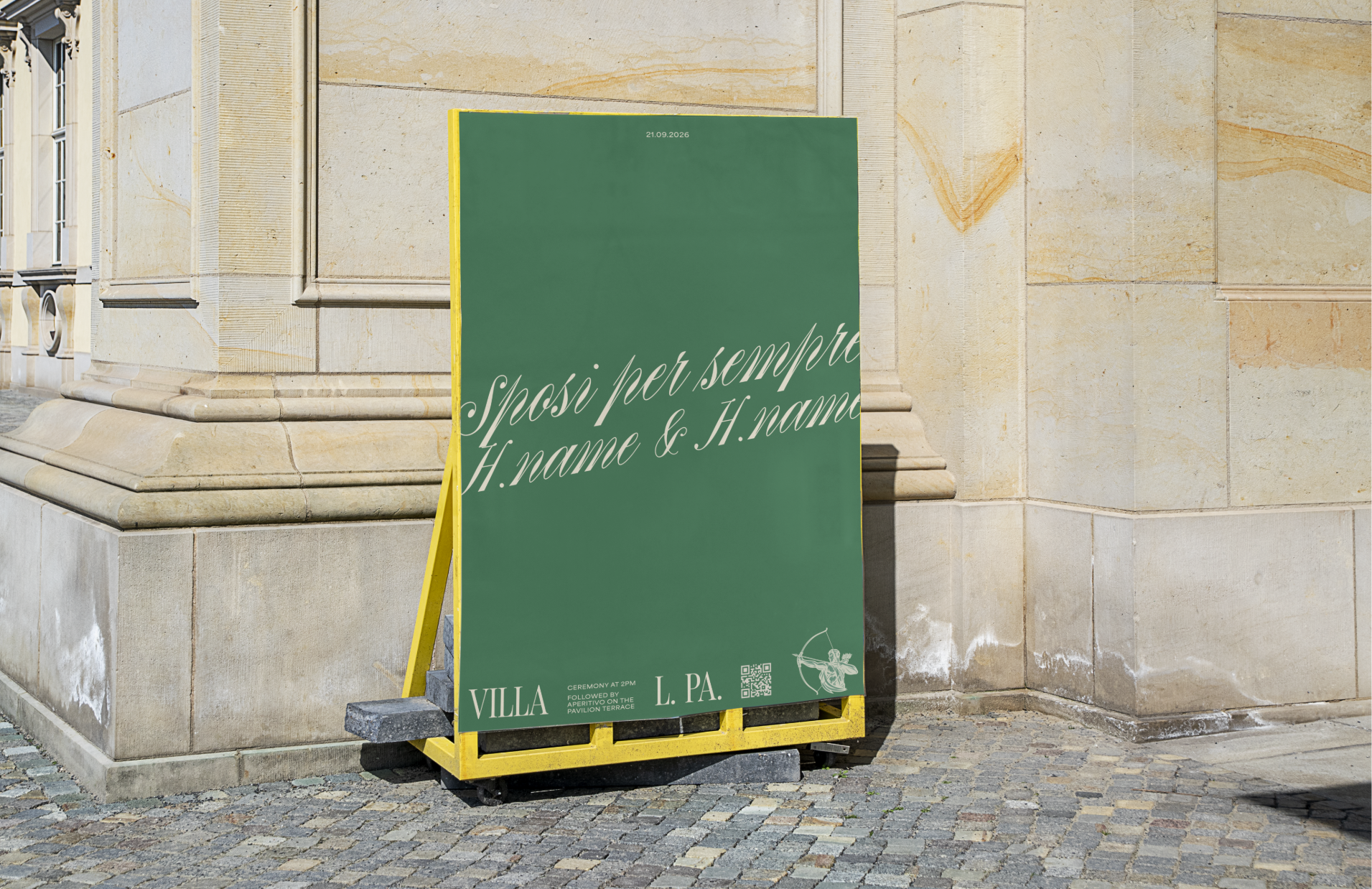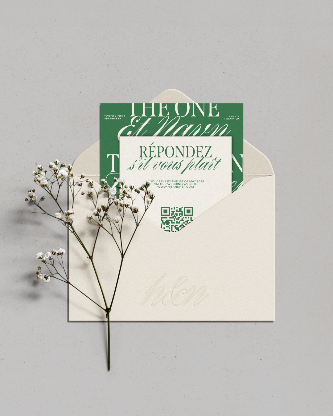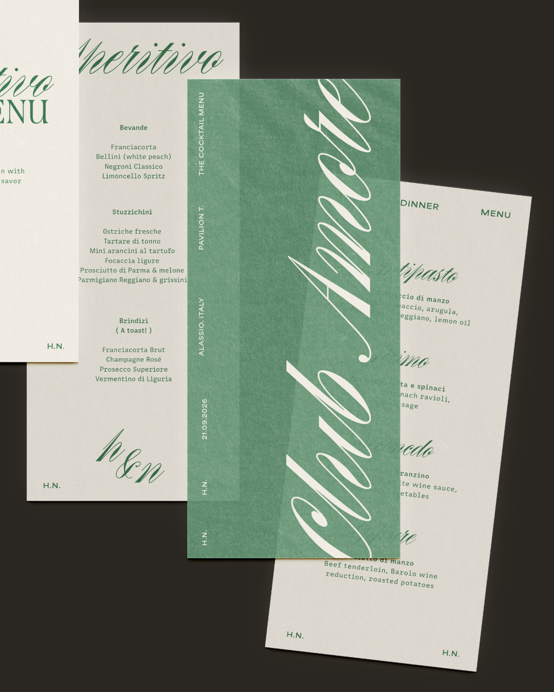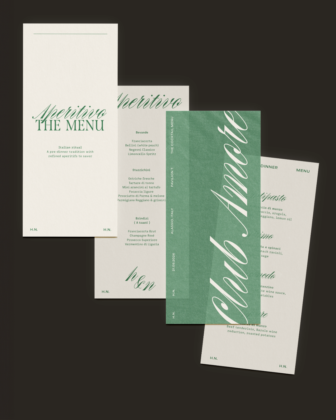 Concept, design and art direction for a wedding in Italy. Rooted in classic Italian elegance and reinterpreted through a contemporary lens, the project combines a typographic mix of contrasting styles to balance romance, tradition and modern design, supported by a palette of Mediterranean green, beige and off-white for a refined look. Italian drama meets soft minimalism and modern visual aesthetics.